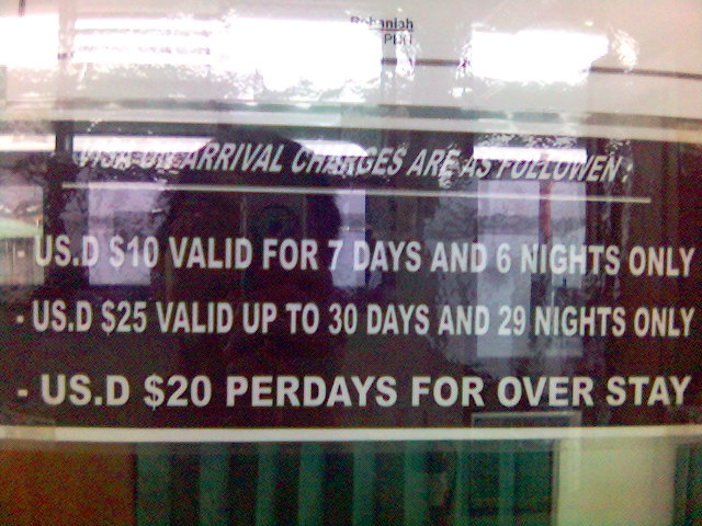 The Visa fee is US$ 10 for 7 days and US$ 25 for 30 days.